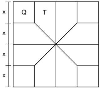 Questão 31 – Para efeito decorativo, um arquiteto dividiu o piso de um salão quadrado em 8 regiões com o formato de trapézios retângulos congruentes (T), e 4 regiões quadradas congruentes (Q), conforme mostra a figura: