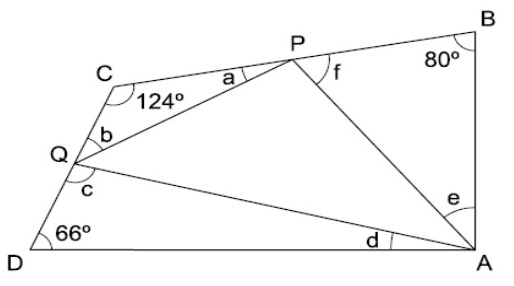 A soma dos ângulos internos do triângulo APQ é 180º, que é o valor da soma dos ângulos internos de qualquer triângulo. O valor de a + b + c + d + e + f é igual a