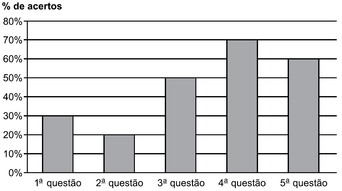 04 de 10 – Uma prova continha cinco questões objetivas, numeradas de 1 a 5, em que cada resposta correta valia 2 pontos, sendo a nota final da prova de cada candidato dada pela soma dos pontos de cada questão respondida corretamente. A tabela mostra a porcentagem de respostas corretas obtidas em cada questão.
