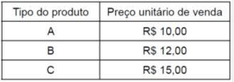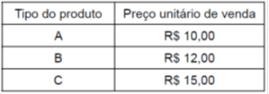 Uma loja trabalha com produtos que são classificados em apenas três tipos. Na tabela, constam os preços de venda de cada tipo do produto: