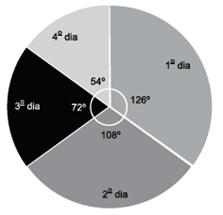 Se o ângulo dos setores que representam o número de visitantes registrados no primeiro dia e no segundo dia medem 126º e 108º, respectivamente, conforme indicado no gráfico, então a diferença entre o número de pessoas que visitaram a Mostra no primeiro dia e no segundo dia foi igual a