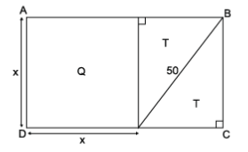 Um cartaz retangular ABCD foi dividido em uma região quadrada (Q) e duas regiões congruentes com formato de triângulo retângulo (T), conforme mostra a figura, cujas dimensões são indicadas em centímetros.
