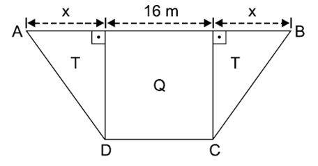 Um pátio escolar, com a forma de um trapézio ABCD, foi dividido em uma região quadrada Q e duas regiões triangulares congruentes T, conforme mostra a figura, com dimensões indicadas em metros.