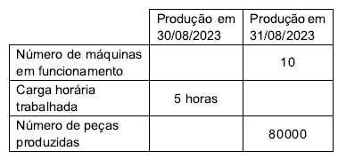 Sabendo-se que as informações apresentadas são proporcionais, que em 30/08/2023 o número de máquinas em funcionamento era um quinto maior que o número de máquinas trabalhando no dia seguinte, e que o número de peças produzidas em 31/08/2023 foi quatro terços do número de peças produzidas no dia anterior, é correto afirmar que a carga horária trabalhada no dia 31/08/2023 foi de