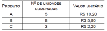 (Vunesp) – A tabela a seguir mostra o número de unidades compradas dos produtos A, B e C, e seus respectivos valores unitários.