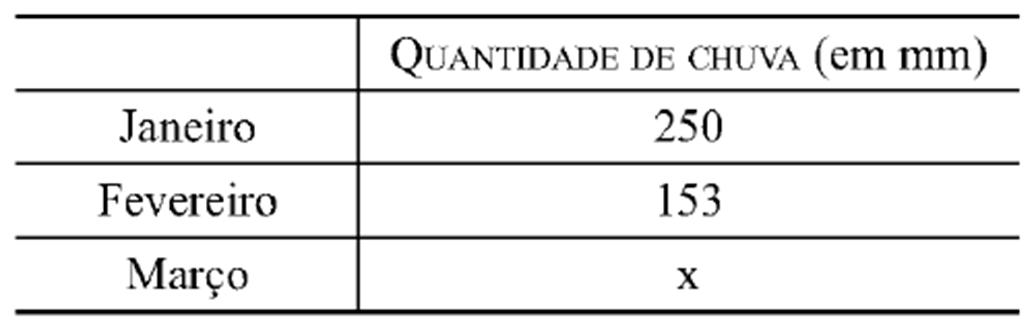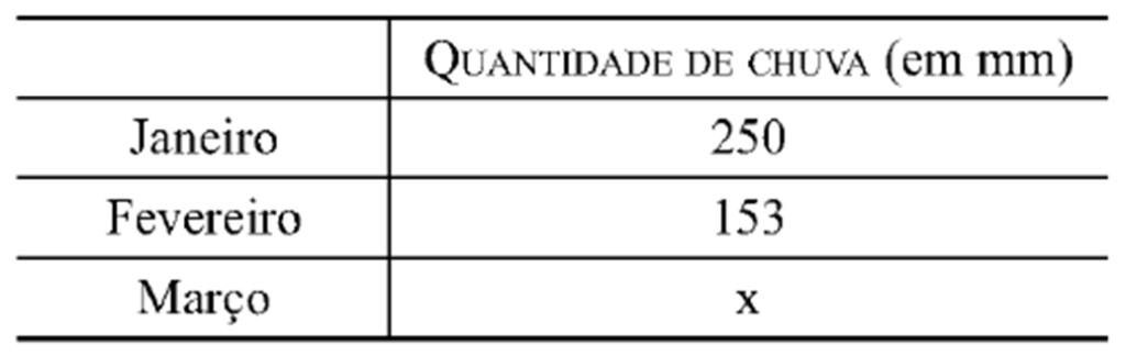 (Vunesp) – A quantidade de chuva, em mm, que caiu em uma cidade, durante os meses de janeiro, fevereiro e março deste ano, está registrada na seguinte tabela: