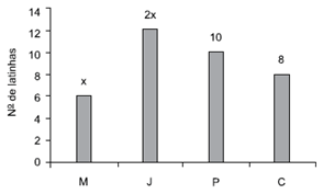 (Vunesp) – Quatro amigos, Marcos (M), Jorge (J), Pedro (P) e Caio (C) foram a um churrasco e cada um deles levou uma determinada quantidade de latinhas de cerveja, conforme mostra o gráfico.