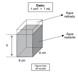 (Vunesp) – Um recipiente, na forma de um prisma reto de base quadrada, com 8 cm de lado, estava totalmente cheio de água. Desse recipiente foram retirados 160 mL, conforme mostra a figura.